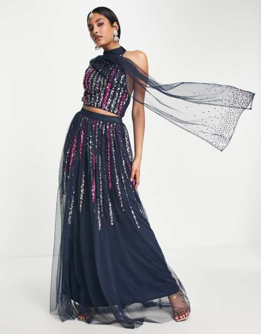 Maya lehenga multicoloured stripe sequin maxi skirt in navy co ord
