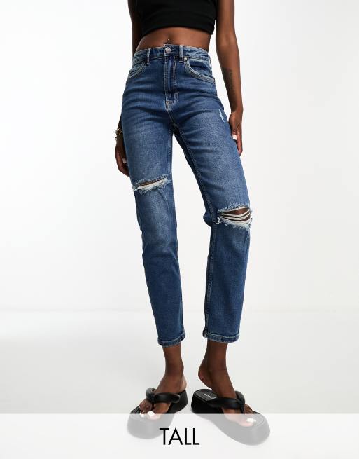 Stretchy high waisted mom jeans clearance, Stradivarius Tall slim mom jean with stretch and rip in medium blue clearance