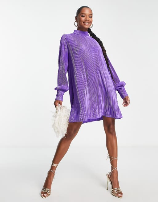 NaaNaa PETITE plisse long sleeve smock dress in purple ASOS