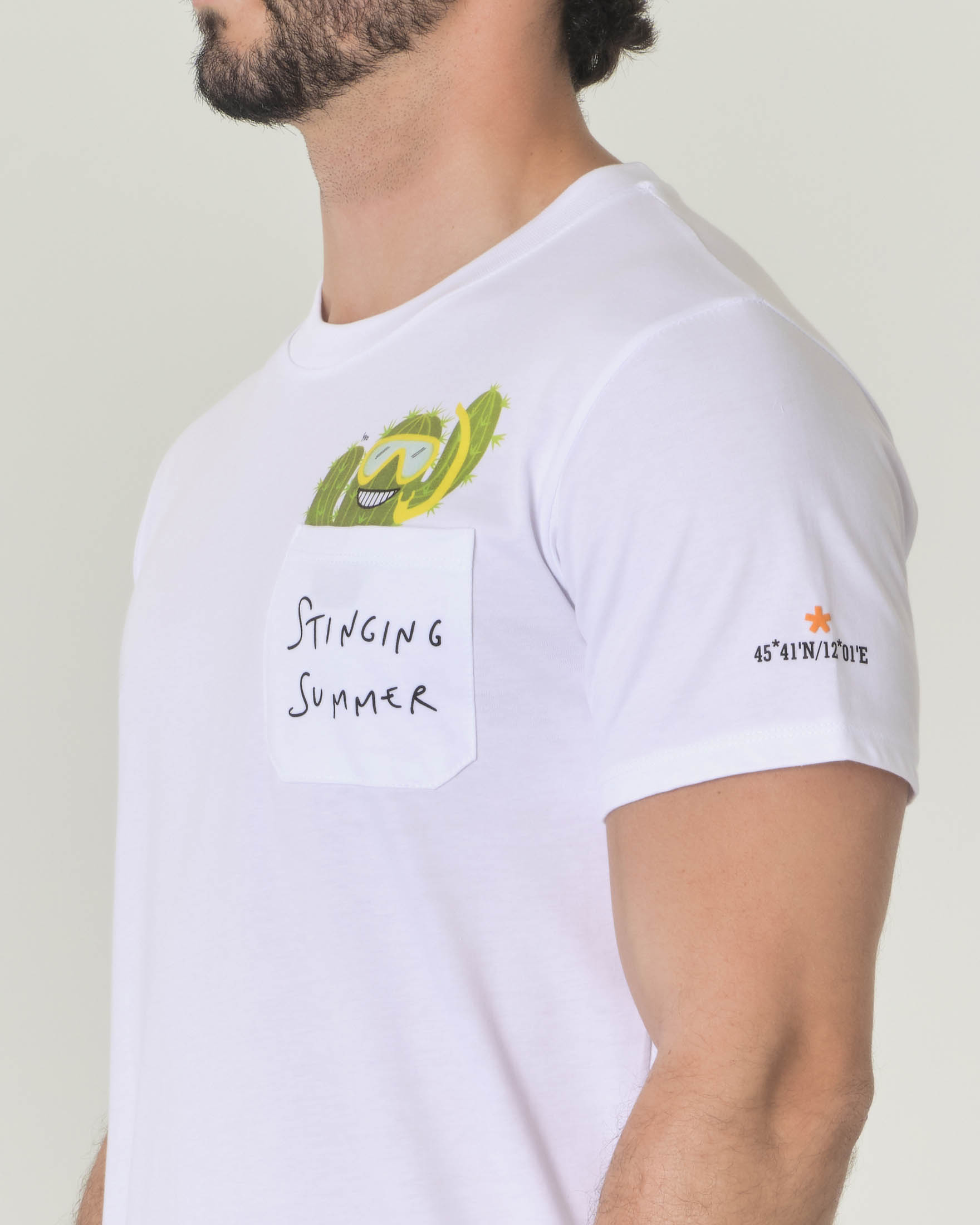 T shirt con cactus clearance, T shirt bianca mezza manica in jersey di cotone con taschino e clearance