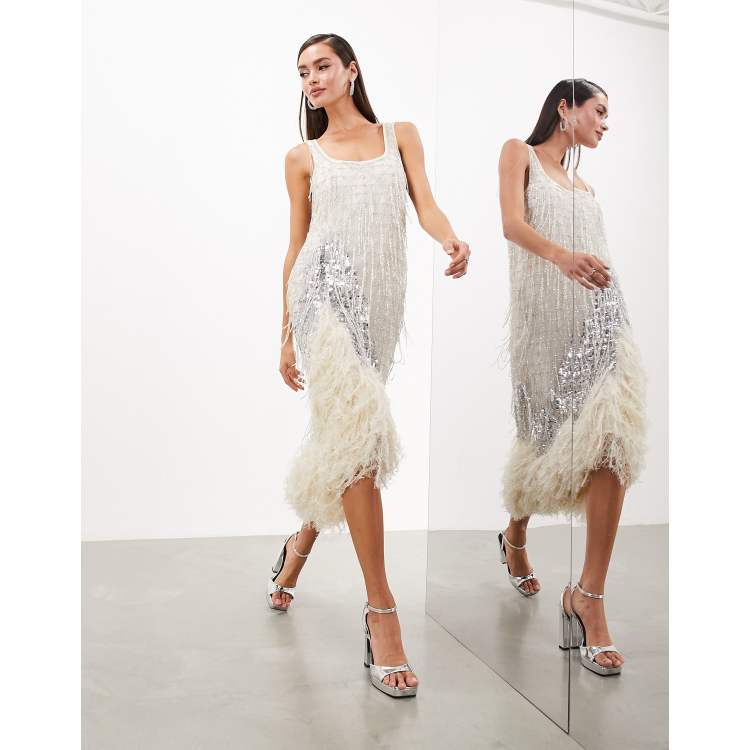 ASOS EDITION scoop neck embellished tassel midi dress with faux feather hem in silver