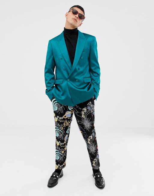 ASOS DESIGN slim double breasted blazer in teal high shine