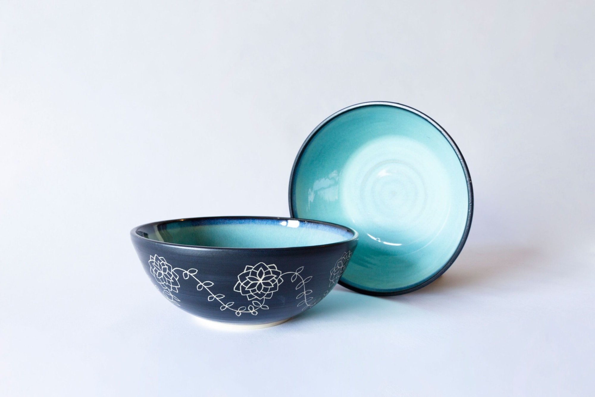 Turquoise Black Deep Serving Bowl With Hand Carved Design by