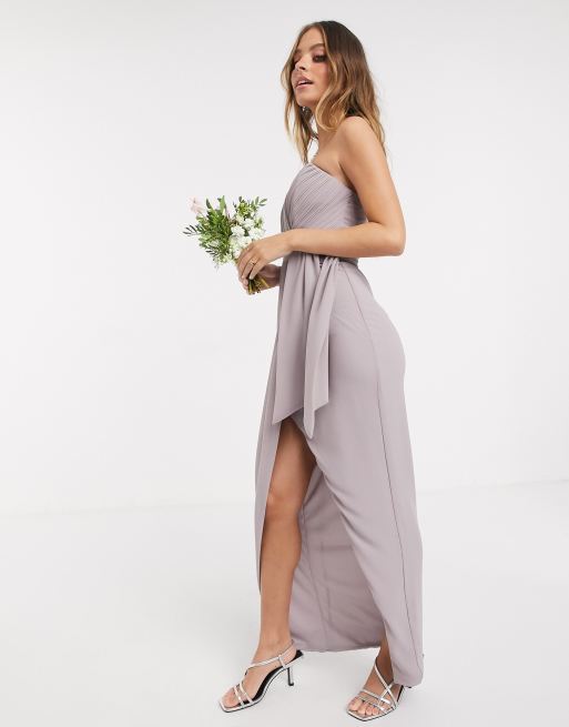 TFNC Petite bridesmaid exclusive bandeau wrap midaxi dress with pleated detail in gray