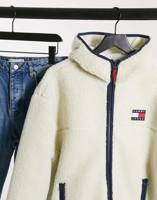 Tommy Jeans sherpa teddy zip up hooded jacket in ecru