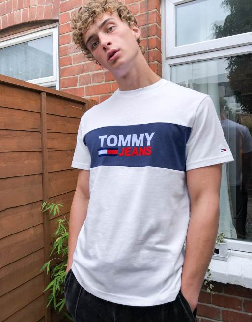 Tommy jeans men's t shirt clearance, Tommy Jeans color block chest panel logo t shirt in white clearance
