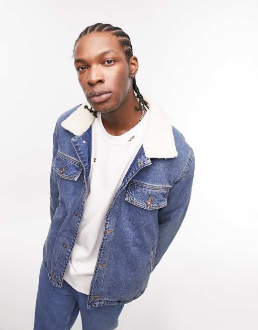 TOPMAN Topman borg collar denim jacket in mid wash blue Blue Men s Denim Jacket YOOX