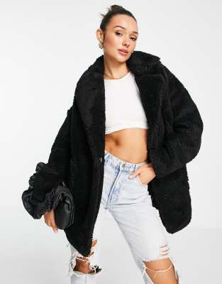 Topshop Borg Midi Coat With Patch Pockets In Black ModeSens