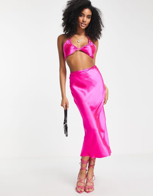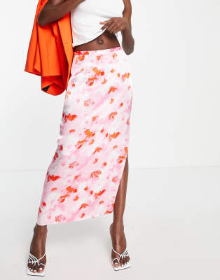 Topshop Clean Waist Side Split Satin Midi Skirt In Pink And Red