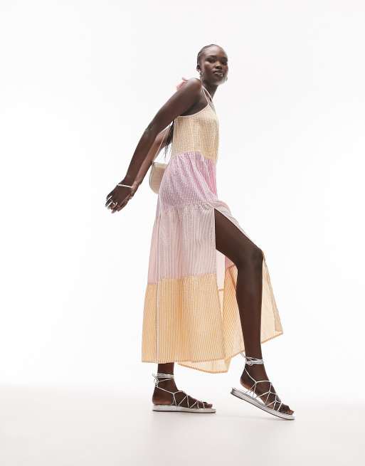 Topshop Tall tiered midaxi beach dress in orange and pink stripes