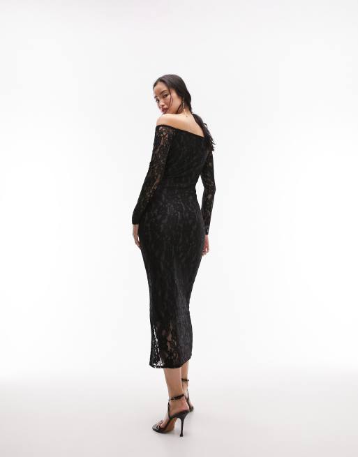 Topshop lace bardot long sleeve midi dress in black ASOS