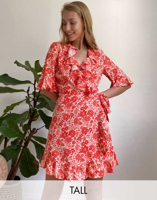 Topshop Tall wrap mini tea dress in red floral