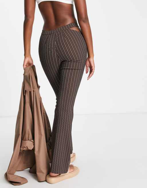 Topshop one side cut out bengaline flared pants in brown pinstripe