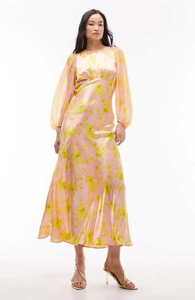 Topshop Floral Long Sleeve Satin Midi Dress In Pink Multi ModeSens