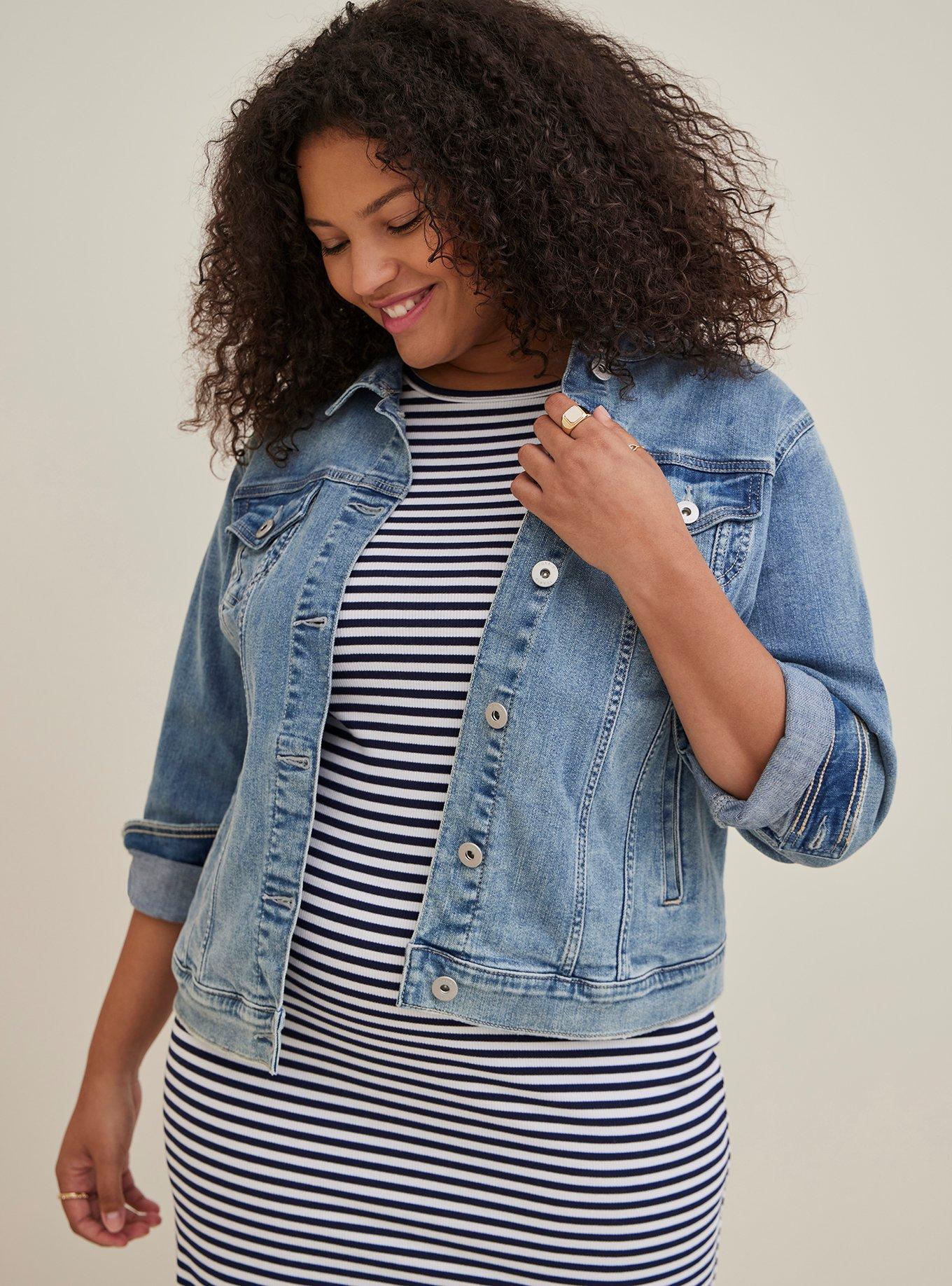 Torrid denim jacket clearance, Plus Size Medium Wash Distressed Denim Trucker Jacket Torrid clearance