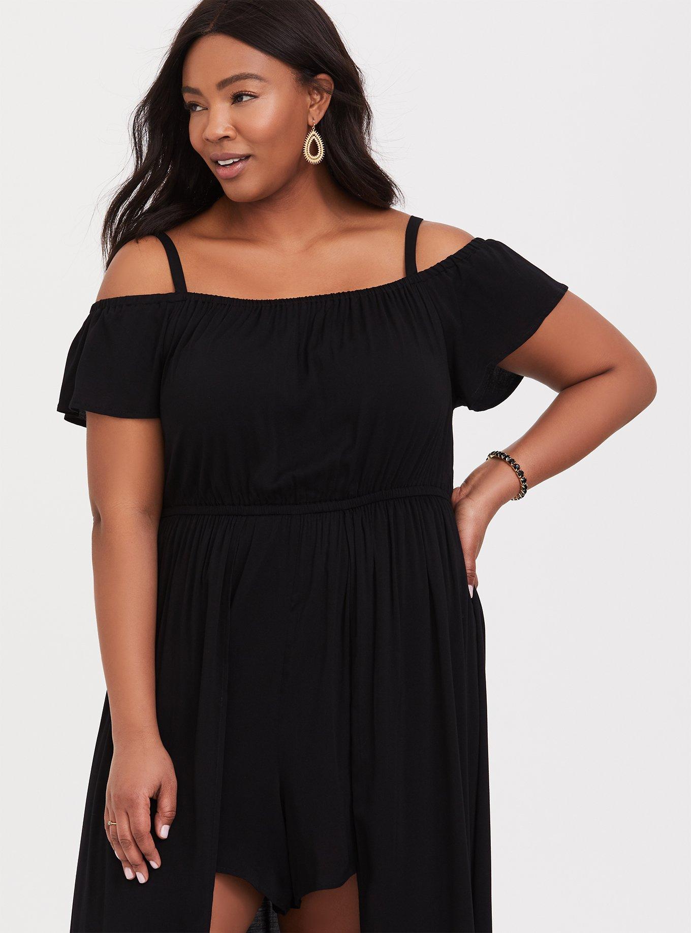 Plus Size Black Challis Cold Shoulder Walk Through Romper Torrid