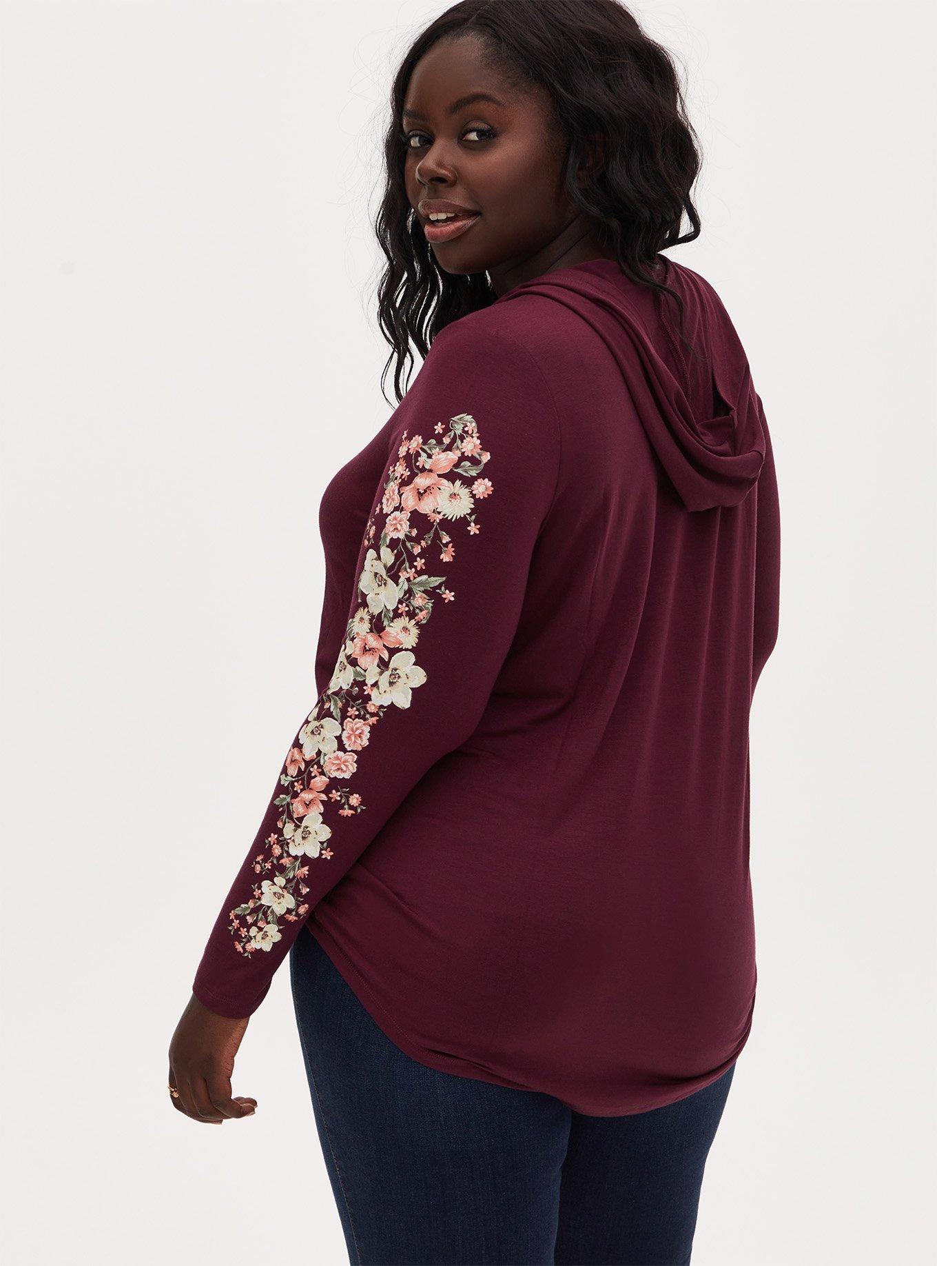 Plus Size Super Soft Burgundy Purple Floral Sleeve Tunic Hoodie