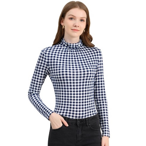 Allegra K Women s Long Sleeve Turtleneck Stretch Slim Plaid Blouse