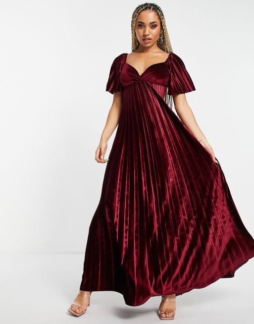 ASOS DESIGN twist back pleated empire waist velvet maxi dress in red