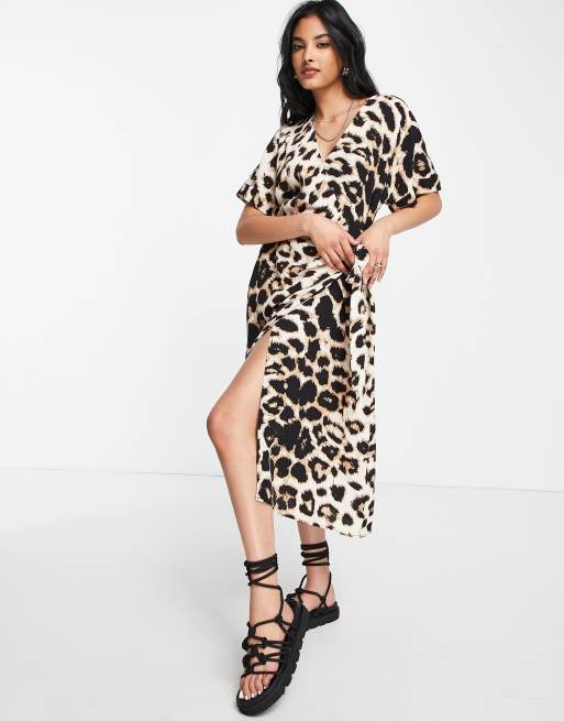 VERO MODA Ulina Leopard Print Wrap Midi Dress in Brown Black