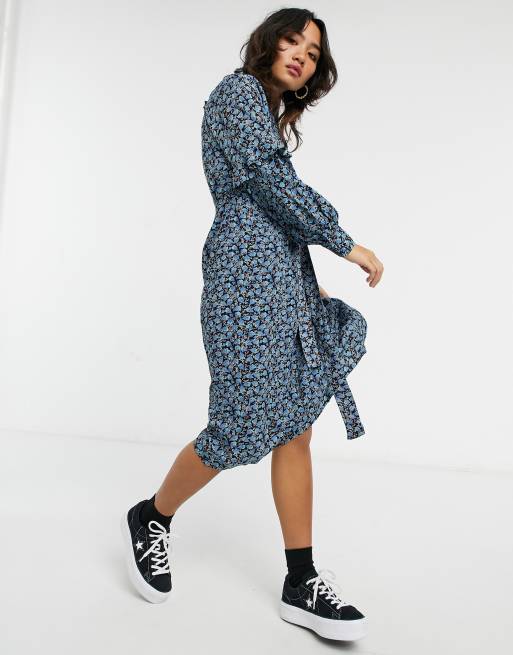 Vero Moda petite midi dress with shirred neck and sleeve detail in blue micro floral