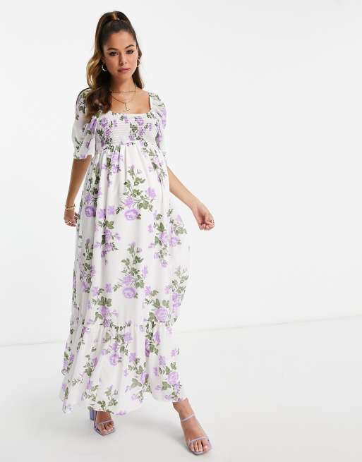 ASOS DESIGN Maternity scoop neck maxi dress with raw edge in white base purple floral print
