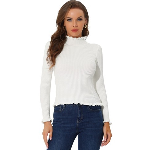 White ribbed sweater women's clearance, Allegra K Women s Classic Fit Lightweight Long Sleeves Ruffle Mock Neck Sweater White Small clearance