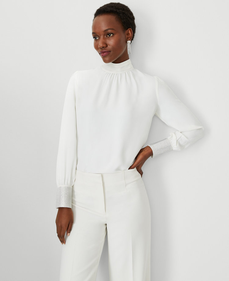 White turtleneck blouse clearance, Crystal Cuff Pintucked Mock Neck Popover clearance