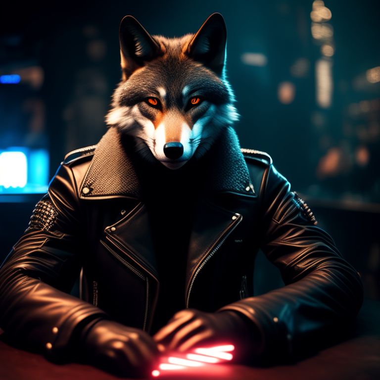 dapper worm934 anthropomorphic wolf wearing leather biker jacket