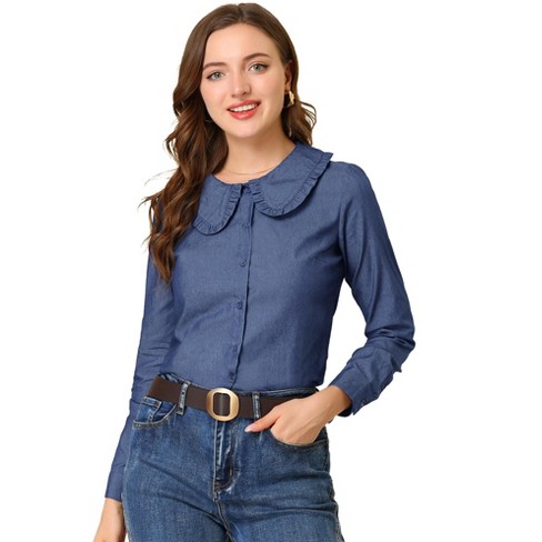 Allegra K Women s Peter Pan Collar Ruffled Button Down Denim Shirt Dark Blue Small