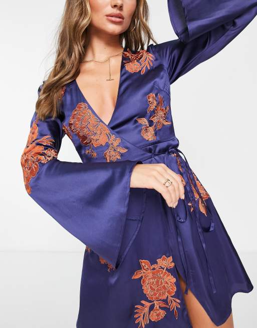 ASOS DESGIN embroidered floral mini wrap dress with flared sleeves