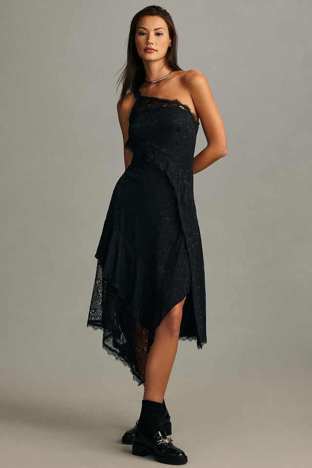 By Anthropologie One Shoulder Asymmetrical Lace Midi Dress