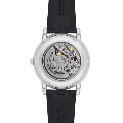 Emporio Armani Luigi Silver Skeleton Dial Black Leather Strap