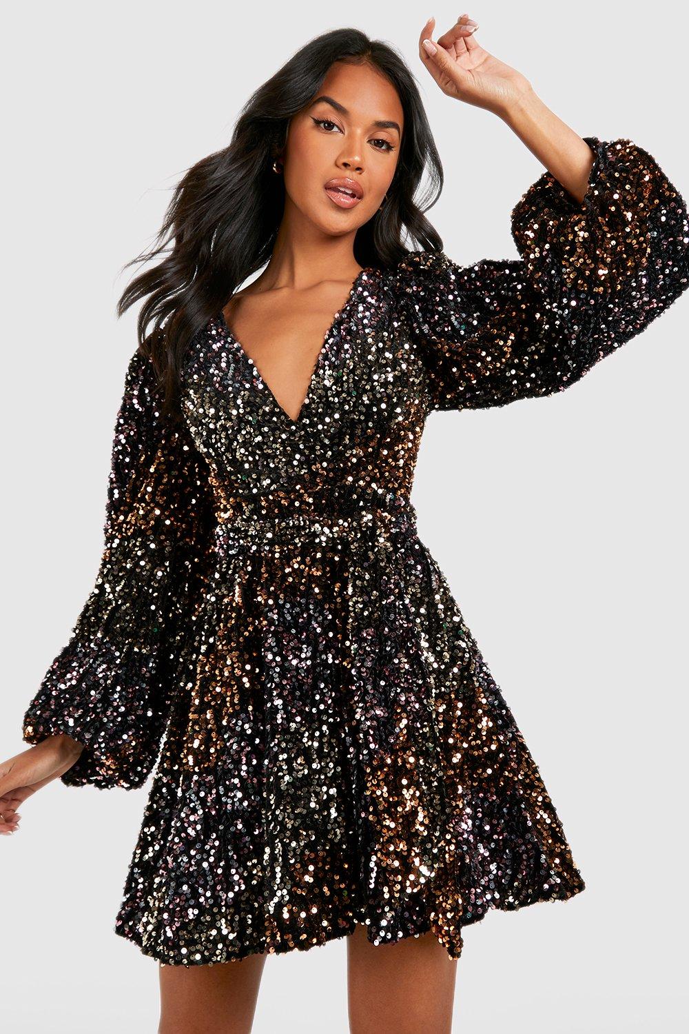 Suncolour Deep V Neck Sequin Skater Mini Dress Long Sleeve Sequin