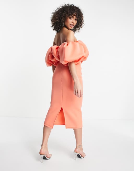 Asos coral dress clearance, ASOS DESIGN off shoulder ruffle midi prom dress in coral clearance