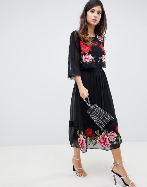 Asos design double layer midi embroidered dress with long sleeves clearance