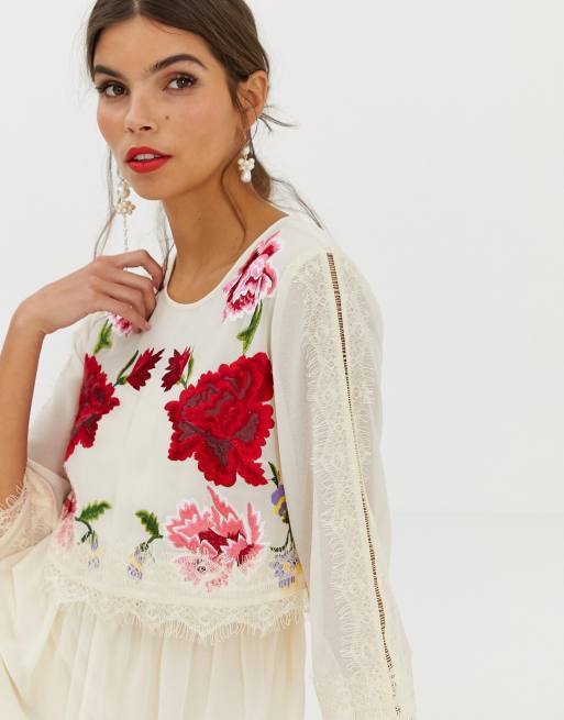 ASOS DESIGN double layer midi embroidered dress with long sleeves