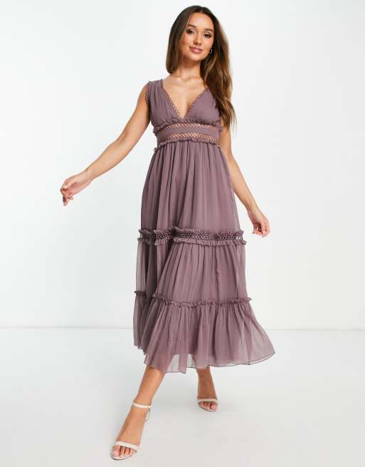 ASOS DESIGN lace insert midi dress with ruffle detail in mauve ASOS