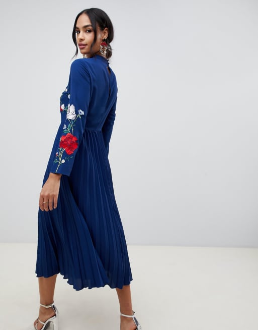 Asos design pleated high neck midi dress with embroidery clearance, ASOS DESIGN Tall high neck pleated long sleeve midi skater dress with embroidery in navy clearance
