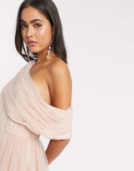 Asos design tulle one shoulder maxi dress clearance, ASOS DESIGN tulle fallen shoulder maxi dress in light gold clearance