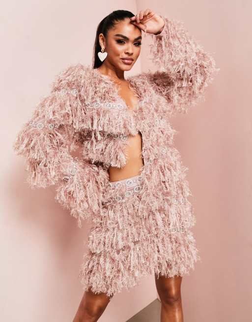 ASOS LUXE feather look jacket with embellished detail in pink part of a set