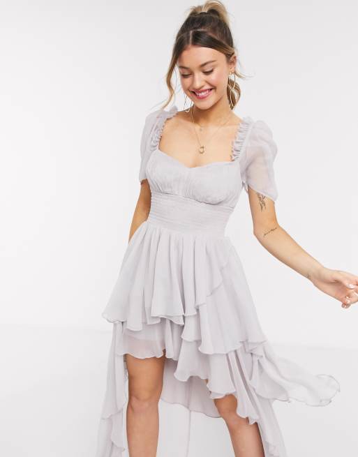 ASOS DESIGN shirred waist high low hem maxi dress with puff sleeve