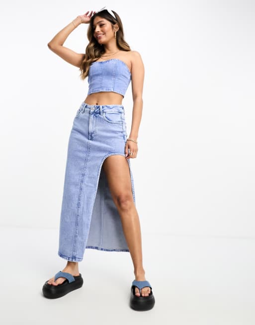 ASOS DESIGN denim midi skirt with high split in bromo wash part of a set
