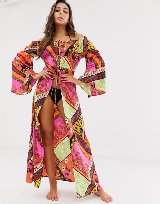 Asos kimono plage clearance, ASOS DESIGN Glam Kimono de plage long paules d nud es et imprim foulard clearance