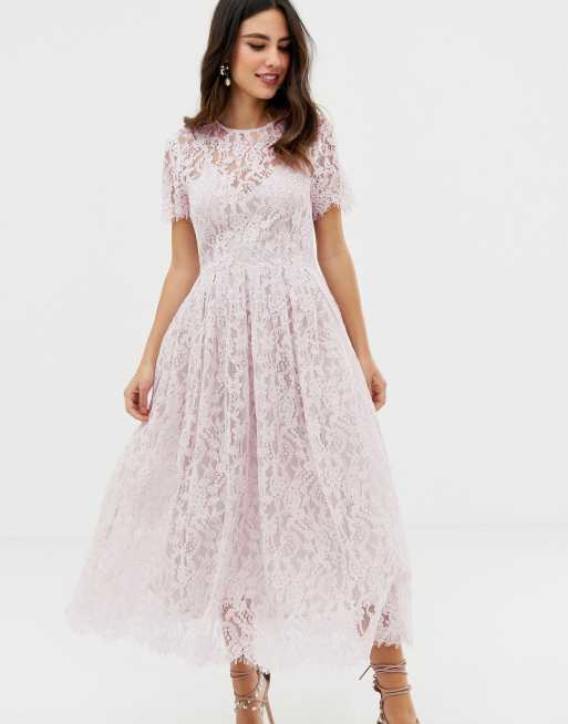 ASOS DESIGN lace midi dress with ribbon tie and open back in soft rose