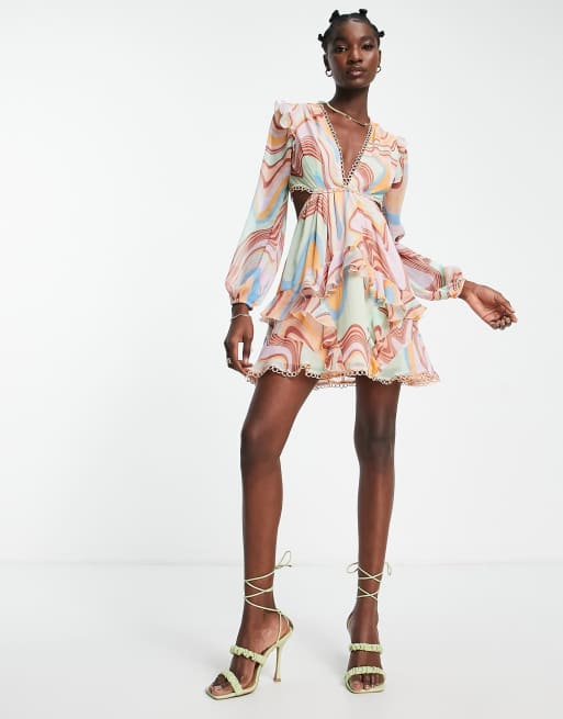 ASOS DESIGN long sleeve mini dress in swirl print with circle
