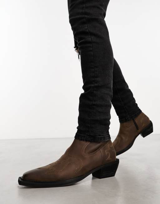ASOS DESIGN cuban heeled chelsea boot in brown leather with square toe
