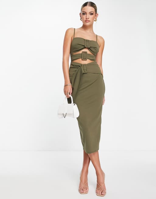 Asos midi dress with full skirt and belt clearance, ASOS DESIGN triple belt cami midi dress in khaki clearance