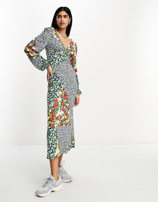 ASOS DESIGN long sleeve v neck midi dress in mixed print