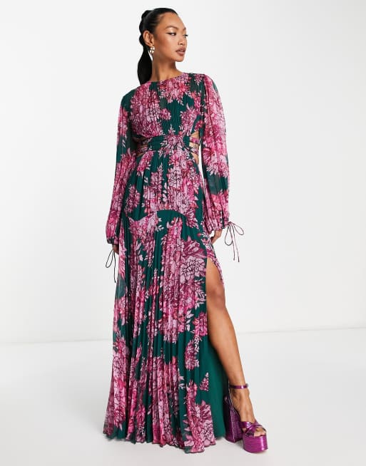 Asos pleated maxi dress clearance, ASOS DESIGN pleated maxi dress with ruched waist detail in green with pink floral print clearance